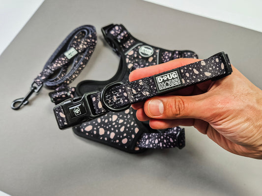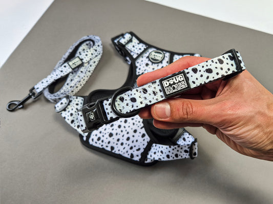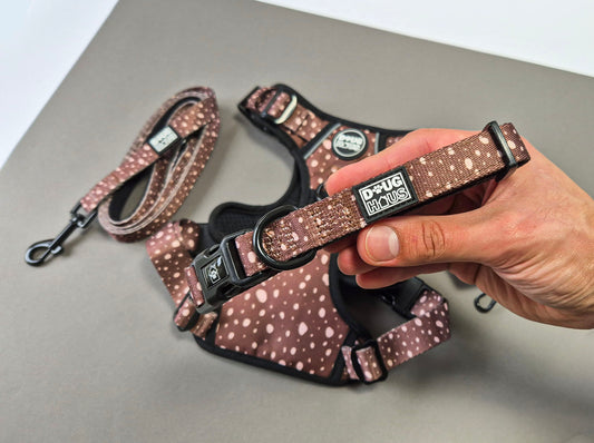 A selection of stylish printed dog accessories for the neutral loving dog owners.